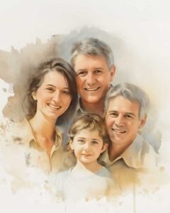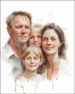 Goldfingers artists specialize in creating radiant, lifelike portraits rendered with premium watercolor pigments on archival paper. Our method emphasizes fluid washes, controlled pigment layering, and delicate edge definition to capture luminous color, atmosphere, and depth.